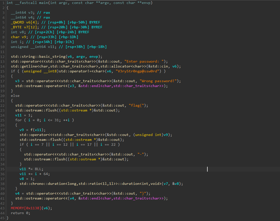 state = 1 out = [] for i inrange(32): fn = fib(state)[0] out.append(charset[fn]) if i in (7, 12, 17, 22): out.append("-") state = (state*8 + 64 + i)&mask64 # c中64位int溢出处理 print("flag{" + "".join(out) + "}") # flag{10632674-1d219-09f29-14769-f60219a24}