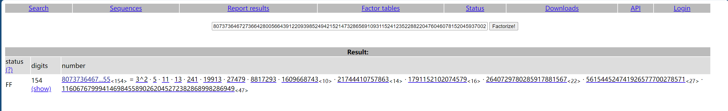 from collections import Counter from Crypto.Util.number import * e = 36346110007425305872660997908648011390452485009167380402907988449045651435844811625907 n = 8073736467273664280056643912209398524942152147328656910931152412352288220476046078152045937002526657533942284160476452038914249779936821603053211888330755 c = 8042279705649954745962644909235780183674555369775538455015331686608683922326562829164835918982642084136603628007677118144681339970688028985720674063973679