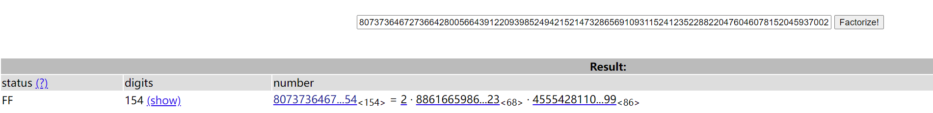 from Crypto.Util.number import * import itertools N = 3333577291839009732612693330613476891341287017491683764014849337158389717338712200133085615150269196268856288361865352673921704626130772582853528604556994221890454520933132803888321775335519781063447756692130742361931522856942232406992357982482263472763363458621836220024977864980600979194500121897419553619426163227 e = 65537 c = 1277272201928931051067525742142583320131498687502905469530557519241347169899260720694873154669476372724906606385788056536109971768256973988460766527896895880291037980646963981472637862512247195798266373251524526460097881602691641026093728861572872156172787168597410496150253340538386296663073088345799201197096884740